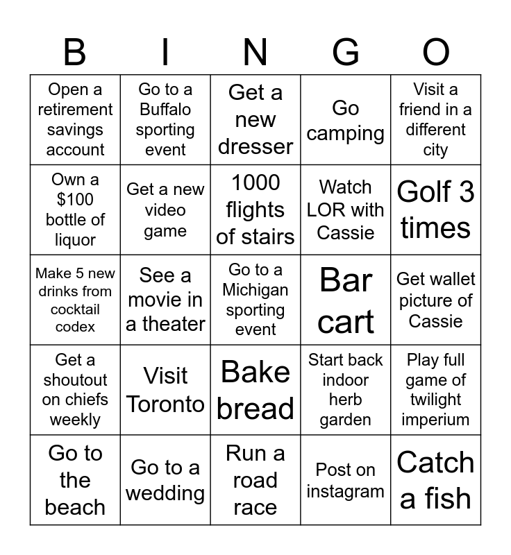 This bingo card has 25 words: Visit Toronto, Run a road race, 1000 flights of stairs, Go to the beach, Visit a friend in a different city, Open a retirement savings account, Own a $100 bottle of liquor, Go to a Buffalo sporting event, Bar cart, Bake bread, Watch LOR with Cassie, Make 5 new drinks from cocktail codex, Start back indoor herb garden, Play full game of twilight imperium, Get a new video game, Catch a fish, Get wallet picture of Cassie, Get a new dresser, Golf 3 times, See a movie in a theater, Go to a Michigan sporting event, Go to a wedding, Get a shoutout on chiefs weekly, Go camping and Post on instagram.