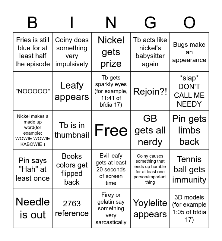 This bingo card has a free space and 24 words: Needle is out, Books colors get flipped back, Tb gets sparkly eyes (for example, 11:41 of bfdia 17), Yoylelite appears, Bugs make an appearance, Fries is still blue for at least half the episode, Coiny does something very impulsively, Nickel gets prize, GB gets all nerdy, Pin gets limbs back, Nickel makes a made up word(for example: WOWIE WOWIE KABOWIE ), Leafy appears, Coiny causes something that ends up horrible for at least one person/important thing, Tennis ball gets immunity, "NOOOOO", 2763 reference, Firey or gelatin say something very sarcastically, Tb acts like nickel's babysitter again, *slap* DON'T CALL ME NEEDY, Pin says "Hah" at least once, Tb is in thumbnail, Evil leafy gets at least 20 seconds of screen time, Rejoin?! and 3D models (for example 1:05 of bfdia 17).