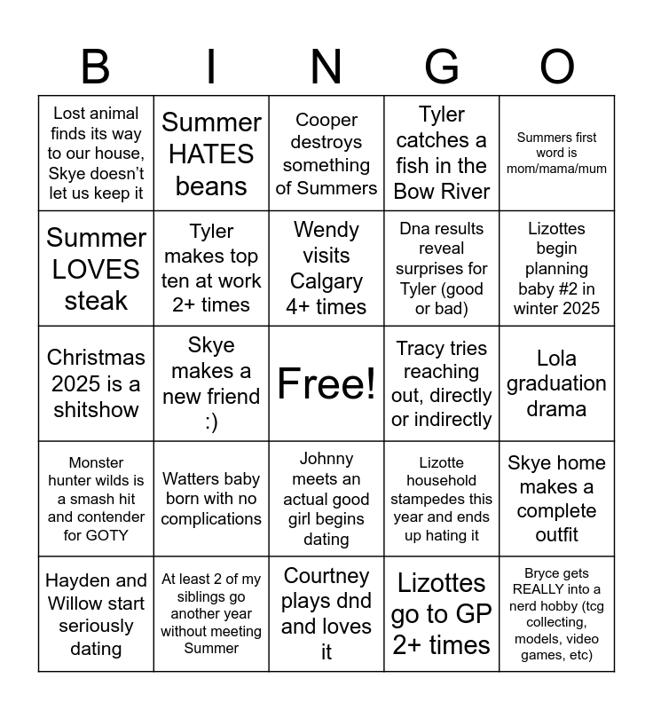 This bingo card has a free space and 24 words: Watters baby born with no complications, At least 2 of my siblings go another year without meeting Summer, Wendy visits Calgary 4+ times, Hayden and Willow start seriously dating, Summers first word is mom/mama/mum, Lost animal finds its way to our house, Skye doesn’t let us keep it, Summer LOVES steak, Summer HATES beans, Tracy tries reaching out, directly or indirectly, Johnny meets an actual good girl begins dating, Dna results reveal surprises for Tyler (good or bad), Christmas 2025 is a shitshow, Lizotte household stampedes this year and ends up hating it, Skye home makes a complete outfit, Tyler makes top ten at work 2+ times, Lizottes go to GP 2+ times, Lola graduation drama, Cooper destroys something of Summers, Lizottes begin planning baby #2 in winter 2025, Skye makes a new friend :), Bryce gets REALLY into a nerd hobby (tcg collecting, models, video games, etc), Monster hunter wilds is a smash hit and contender for GOTY, Tyler catches a fish in the Bow River and Courtney plays dnd and loves it.