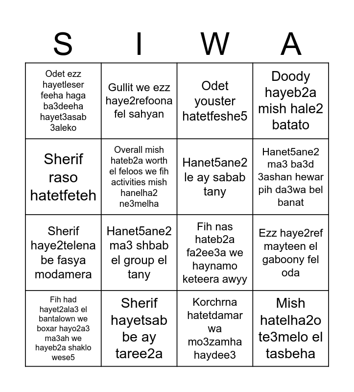 This bingo card has 16 words: Sherif hayetsab be ay taree2a, Ezz haye2ref mayteen el gaboony fel oda, Odet youster hatetfeshe5, Odet ezz hayetleser feeha haga ba3deeha hayet3asab 3aleko, Sherif haye2telena be fasya modamera, Gullit we ezz haye2refoona fel sahyan, Fih nas hateb2a fa2ee3a we haynamo keteera awyy, Korchrna hatetdamar wa mo3zamha haydee3, Sherif raso hatetfeteh, Overall mish hateb2a worth el feloos we fih activities mish hanelha2 ne3melha, Fih had hayet2ala3 el bantalown we boxar hayo2a3 ma3ah we hayeb2a shaklo wese5, Doody hayeb2a mish hale2 batato, Hanet5ane2 ma3 shbab el group el tany, Hanet5ane2 ma3 ba3d 3ashan hewar pih da3wa bel banat, Hanet5ane2 le ay sabab tany and Mish hatelha2o te3melo el tasbeha.