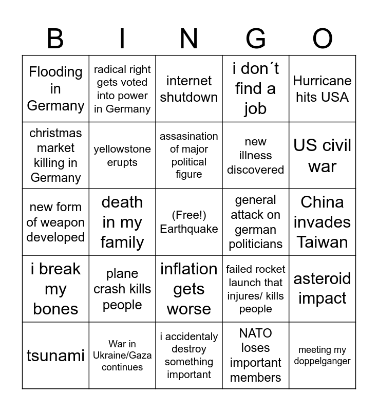 This bingo card has a free space and 24 words: plane crash kills people, War in Ukraine/Gaza continues, assasination of major political figure, tsunami, Hurricane hits USA, Flooding in Germany, christmas market killing in Germany, radical right gets voted into power in Germany, general attack on german politicians, inflation gets worse, new illness discovered, new form of weapon developed, failed rocket launch that injures/ kills people, asteroid impact, yellowstone erupts, NATO loses important members, China invades Taiwan, internet shutdown, US civil war, death in my family, meeting my doppelganger, i break my bones, i don´t find a job and i accidentaly destroy something important.