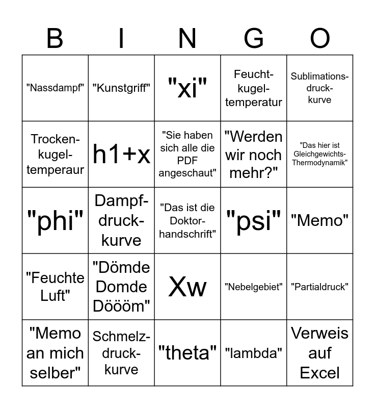 This bingo card has a free space and 24 words: "Dömde Domde Döööm", Schmelz- druck- kurve, "Sie haben sich alle die PDF angeschaut", "Memo an mich selber", Sublimations- druck- kurve, "Nassdampf", Trocken-kugel-temperaur, "Kunstgriff", "psi", Xw, "Werden wir noch mehr?", "phi", "Nebelgebiet", "Partialdruck", h1+x, "lambda", "Memo", "xi", "Das hier ist Gleichgewichts- Thermodynamik", Dampf- druck- kurve, Verweis auf Excel, "Feuchte Luft", Feucht-kugel-temperatur and "theta".
