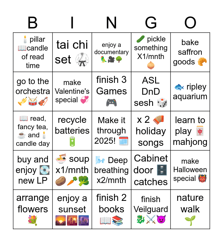 This bingo card has a free space and 24 words: ๐ soup x1/mnth ๐ฅ๐ฅ๐ฅฆ, enjoy a sunset ๐๐๐, finish 3 Games ๐ฎ, arrange flowers ๐, bake saffron goods ๐ฅ, ๐ฏ๏ธpillar ๐candle of read time, go to the orchestra ๐บ๐ฅ๐ป, tai chi set ๐ฅ, x 2 ๐ชholiday songs, ๐ฌ๏ธ Deep breathing x2/mnth, ASL DnD sesh ๐ฒ, ๐ read, fancy tea, โ and๐ฏ๏ธcandle day, Cabinet door ๐๏ธ catches, make Halloween special ๐น, make Valentine's special ๐, finish Veilguard๐โ๏ธ๐, learn to play ๐mahjong, enjoy a documentary ๐ฆ๐ฅ๐ณ, ๐ ripley aquarium, recycle batteries ๐, nature walk ๐ฑ, buy and enjoy ๐ฝnew LP, ๐ฅ pickle something X1/mnth ๐ง and finish 2 books ๐๐.