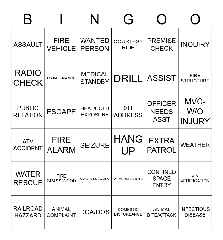 This bingo card has 142 words: Free!, ABD PAIN, ALLERGIC REACTION, ALTERED MENTAL, ANIMAL BITE/ATTACK, ATV ACCIDENT, BACK PAIN, BLEEDING/LACERATION, BREATHING PROBLEM, BURNS, CARBON MONOXIDE, CARDIAC ARREST, CHEST PAIN, CHOKING, CONTROL BURN, DIABETIC PROBLEM, DOA/DOS, ELEVATOR, EQUIPMENT REPAIR, EYE INJURIES, FALL, FIRE ALARM, FIRE GRASS/WOOD, FIRE MISC/OTHER, FIRE OUTSIDE, FIRE STRUCTURE, FIRE VEHICLE, FLOODING, FUEL SPILL, GAS LEAK, GUNSHOT/STABBING, HAZMAT, HEADACHE, HEAT/COLD EXPOSURE, INFECTIOUS DISEASE, JET CREW TRANSPORT, LIFTING ASSIST, MEDICAL ALARM, MEDICAL STANDBY, MENTAL PATIENT, MVC-UNKNOWN, MVC-INJURY, MVC-W/O INJURY, MVC-PEDESTRIAN, MVC-TRAIN/CAR, ODOR STRANGE, OVERDOSE, POLE DOWN, POWER OUTAGE, PREGNANCY, PT TRANSFER, SEARCH-RESCUE, SEIZURE, SEXUAL ASSAULT, SICK PERSON, SMOKE INV (OUTSIDE), STROKE, UNCONSCIOUS, UNKNOWN, UTILITIES, WATER RESCUE, WEATHER, TRAUMATIC INJURY, TREE DOWN, ABDUCTION, 911 ADDRESS, ABUSE, ADMINISTRATIVE, ALARM, ANI/ALI FAILURE, ANIMAL COMPLAINT, ASSAULT, ASSIST, ATV COMPLAINT, BOLO REPORT, BURGLARY, BUSY/URGENT/10-6, CONFINED SPACE ENTRY, COURTESY RIDE, CRIMINAL MISCHIEF, DAMAGE/VANDALISM, DHR, DISTURBANCE/NUISANCE, DOMESTIC DISTURBANCE, DRILL, DRUGS, ESCAPE, ESCORT, EXTRA PATROL, FLAG DOWN, FOOT PATROL, FOUND PERSON, FRAUD/FORGERY, HANG UP, HARASSMENT, HIGH-SPEED CHASE, INDECENCY, INFORMATION, INMATE RELEASE, INMATE TRANSPORT, INQUIRY, JAIL CHECKS, LOCKED VEHICLE, LOST PERSON, MAINTENANCE, MISCELLANEOUS, MISSING/RUNAWAY, MISTAKE, MUTUAL AID, OFFICER NEEDS ASST, OPEN LINE, OPEN DOOR, PREMISE CHECK, PUBLIC RELATION, PUBLIC SERVICE, RADIO CHECK, RAILROAD HAZZARD, RAILROAD OPEN-CLOSE, RECKLESS DRIVER, REGISTRATION INQUIRY, REPORT, REPOSSESSION, ROAD OPEN-CLOSING, ROBBERY, SERVE PAPER J4, STANDBY, SUPPLEMENTAL, SUSPICIOUS, TEST, THEFT/LARCENY, TRAFFIC LIGHT, TRAFFIC STOP, TRAFFIC VIOLATION, TRAINING, TRESPASSING, UNAUTHORIZED USE, VIN VERIFICATION, WANTED PERSON, WEAPONS/SHOTS, WELFARE CHECK, WRECKER REQUEST and WRONG NUMBER.