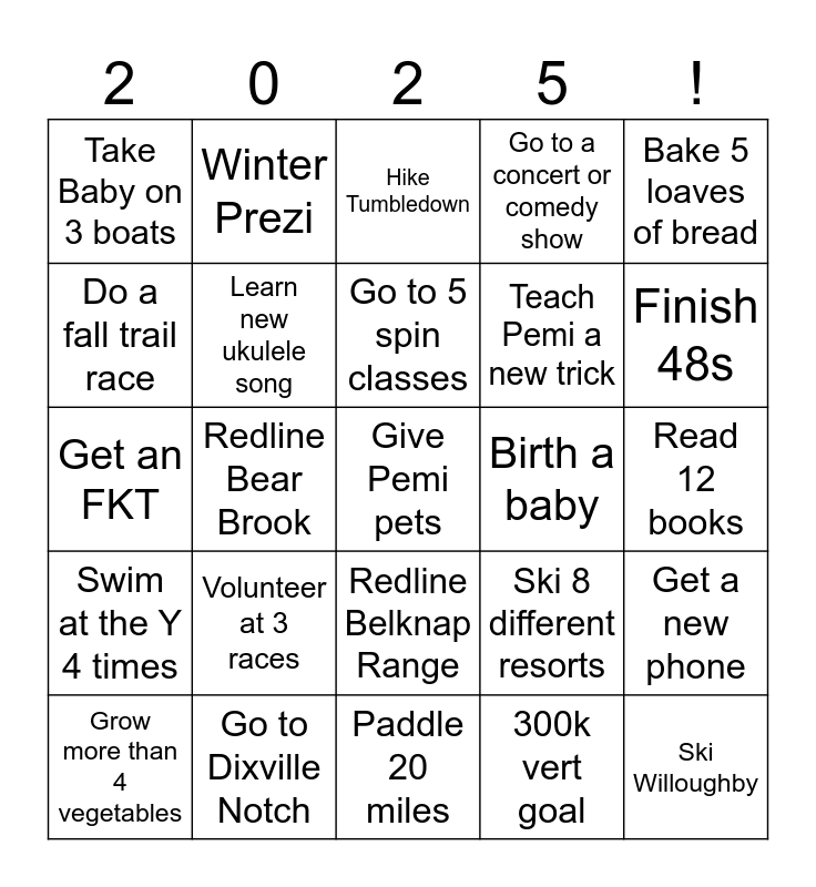 This bingo card has a free space and 24 words: Volunteer at 3 races, Go to Dixville Notch, Go to 5 spin classes, Grow more than 4 vegetables, Bake 5 loaves of bread, Take Baby on 3 boats, Do a fall trail race, Winter Prezi, Birth a baby, Redline Belknap Range, Teach Pemi a new trick, Get an FKT, Ski 8 different resorts, Get a new phone, Learn new ukulele song, 300k vert goal, Read 12 books, Hike Tumbledown, Finish 48s, Redline Bear Brook, Ski Willoughby, Swim at the Y 4 times, Go to a concert or comedy show and Paddle 20 miles.
