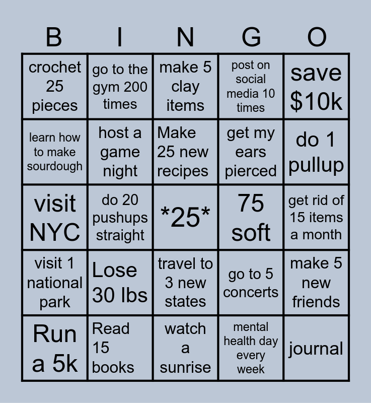This bingo card has a free space and 24 words: Lose 30 lbs, Read 15 books, Make 25 new recipes, Run a 5k, save $10k, crochet 25 pieces, learn how to make sourdough, go to the gym 200 times, 75 soft, travel to 3 new states, get my ears pierced, visit NYC, go to 5 concerts, make 5 new friends, host a game night, mental health day every week, get rid of 15 items a month, make 5 clay items, do 1 pullup, do 20 pushups straight, journal, visit 1 national park, post on social media 10 times and watch a sunrise.