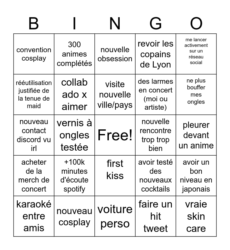 This bingo card has a free space and 24 words: +100k minutes d'écoute spotify, nouveau cosplay, visite nouvelle ville/pays, karaoké entre amis, me lancer activement sur un réseau social, convention cosplay, rééutilisation justifiée de la tenue de maid, 300 animes complétés, nouvelle rencontre trop trop bien, first kiss, des larmes en concert (moi ou artiste), nouveau contact discord vu irl, avoir testé des nouveaux cocktails, avoir un bon niveau en japonais, collab ado x aimer, faire un hit tweet, pleurer devant un anime, nouvelle obsession, ne plus bouffer mes ongles, vernis à ongles testée, vraie skin care, acheter de la merch de concert, revoir les copains de Lyon and voiture perso.