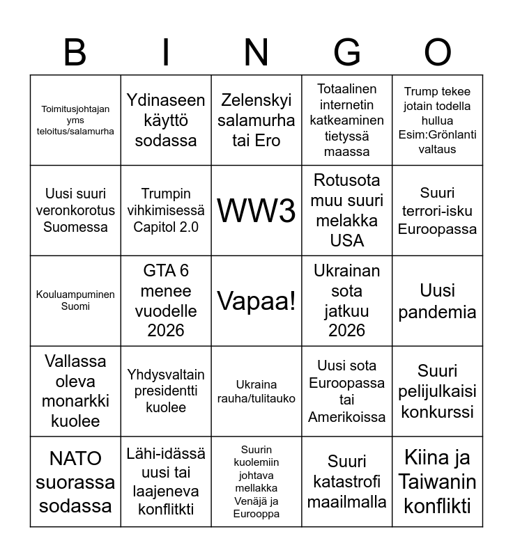 This bingo card has a free space and 24 words: Yhdysvaltain presidentti kuolee, Lähi-idässä uusi tai laajeneva konflitkti, WW3, NATO suorassa sodassa, Trump tekee jotain todella hullua Esim:Grönlanti valtaus, Toimitusjohtajan yms teloitus/salamurha, Uusi suuri veronkorotus Suomessa, Ydinaseen käyttö sodassa, Ukrainan sota jatkuu 2026, Ukraina rauha/tulitauko, Rotusota muu suuri melakka USA, Kouluampuminen Suomi, Uusi sota Euroopassa tai Amerikoissa, Suuri pelijulkaisi konkurssi, Trumpin vihkimisessä Capitol 2.0, Suuri katastrofi maailmalla, Uusi pandemia, Zelenskyi salamurha tai Ero, Suuri terrori-isku Euroopassa, GTA 6 menee vuodelle 2026, Kiina ja Taiwanin konflikti, Vallassa oleva monarkki kuolee, Totaalinen internetin katkeaminen tietyssä maassa and Suurin kuolemiin johtava mellakka Venäjä ja Eurooppa.