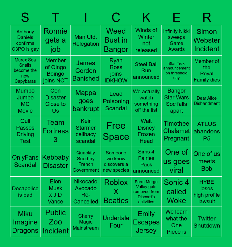 This bingo card has a free space and 48 words: Farm Merge Valley gets removed from Discord's activities, Star Trek announcement on threshold day, Undertale Four, Team Fortress 3, Mappa goes bankrupt, ATLUS abandons P5, Ronnie gets a job, Public Zoo Incident, Infinity Nikki sweeps Game Awards, Someone we know discovers a new species, Simon Webster Incident, Weed Bust in Bangor, Bangor Star Wars Soc falls apart, We actually watch something off the list, Decapolice is bad, Timothee Chalamet Pregnant, Murex Sea Snails become the new Capybaras, Member of the Royal Family dies, Sonic 4 called Woke, Winds of Winter not released, Steel Ball Run announced, Keir Starmer celibacy scandal, Anthony Daniels confirms C3PO is gay, Member of Oingo Boingo joins NCT, HYBE loses high profile lawsuit, James Corden Banished, Dear Alice Disbandment, Miku Imagine Dragons, Lead Poisoning Scandal, Con Disaster Close to Us, We learn what the One Piece is, Walt Disney Frozen Head, One of us meets Bob, Elon Musk x J.D Vance, Gull Passes Driving Test, Sims 4 Fairies Pack announced, One of us goes viral, Mumbo Jumbo MC Movie, Quackity Sued by French Government, Nikocado Avocado Re-Cancelled, OnlyFans Scandal, Twitter Shutdown, Man Utd. Relegation, Cherry Magic Mainstream, Ryan Ross joins IDKHOW, Roblox X Beatles, Kebbaby Disaster and Emily Escapes Jersey.
