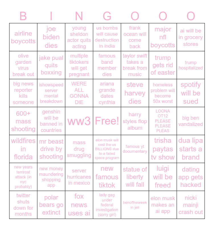 This bingo card has a free space and 48 words: statue of liberty will fall, trump gets rid of easter, lady gag under federal investigation (sorry girl), genshin will be banned in countries, WERE ALL GONNA DIE, big ben vandalized, joe biden dies, polar bears go extinct, major nfl boycotts, elon musk will cost the us BILLIONS due to a failed space program, ai will be in grocery stores, us bombs will cause destruction in india, homeless problem will become 50x worst, steve harvey dies, new years terrirost attack (in nyc probably), LOONA OT12 PLEASE PLEASE PLEAS, olive garden virus break out, trump hospitalized, luigi will be freed, frank ocean will come back, taylor swift takes a break from music, ww3, airline boycotts, jake pual quits boxxing, dating app gets hacked, multiple tiktokers will get pregnant, spotify will be sued, twitter shuts down for months, ariana grande dates cynthia, ishowspeed server mental breakdown, elon musk makes an ai app, harry styles flop album, dua lipa starts a brand, new money maundering shopping app, 600+ mass shooting, famous yt documentary, trisha paytas tv show, big news reporter kills someone, mass drug smuggling, server hurricanes in mexico, wildfires in florida, nicki mainji crash out, young sheldon actor quits acting, fox news uses ai, famous band member dies, new famous tiktok, mr beast drive by shooting and benoftheweek in jail.