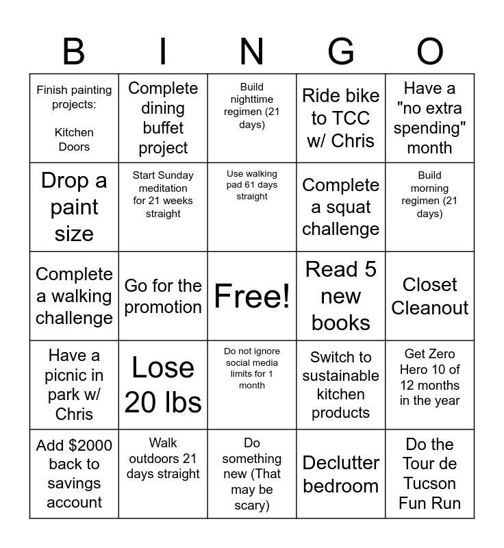 This bingo card has a free space and 24 words: Lose 20 lbs, Walk outdoors 21 days straight, Use walking pad 61 days straight, Add $2000 back to savings account, Have a "no extra spending" month, Finish painting projects: Kitchen Doors, Drop a paint size, Complete dining buffet project, Read 5 new books, Do not ignore social media limits for 1 month, Complete a squat challenge, Complete a walking challenge, Switch to sustainable kitchen products, Get Zero Hero 10 of 12 months in the year, Start Sunday meditation for 21 weeks straight, Declutter bedroom, Closet Cleanout, Build nighttime regimen (21 days), Build morning regimen (21 days), Go for the promotion, Do the Tour de Tucson Fun Run, Have a picnic in park w/ Chris, Ride bike to TCC w/ Chris and Do something new (That may be scary).
