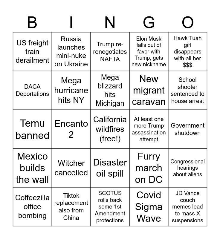 This bingo card has a free space and 34 words: 3rd Trump Impeachment, Covid Sigma Wave, Intel drops to $10 per share, Cybertruck recall, Mexico builds the wall, Mega hurricane hits NY, Hawk Tuah girl disappears with all her $$$, Coffeezilla office bombing, Russia launches mini-nuke on Ukraine, U.S. drones cause problems in Ukraine, Mega blizzard hits Michigan, Trump re-renegotiates NAFTA, Run on toilet paper, Fuckass White House Xmas decorations, At least one more Trump assassination attempt, School shooter sentenced to house arrest, Tiktok replacement also from China, Temu banned, Witcher cancelled, Furry march on DC, Disaster oil spill, Cownado, US freight train derailment, Government shutdown, SCOTUS rolls back some 1st Amendment protections, JD Vance couch memes lead to mass X suspensions, Elon Musk falls out of favor with Trump, gets new nickname, Crumbl cookies cancelled for pride flag campaign, New migrant caravan, DACA Deportations, Live-action Ratatouille announced, Encanto 2, Congressional hearings about aliens and Explosion at Yellowstone.