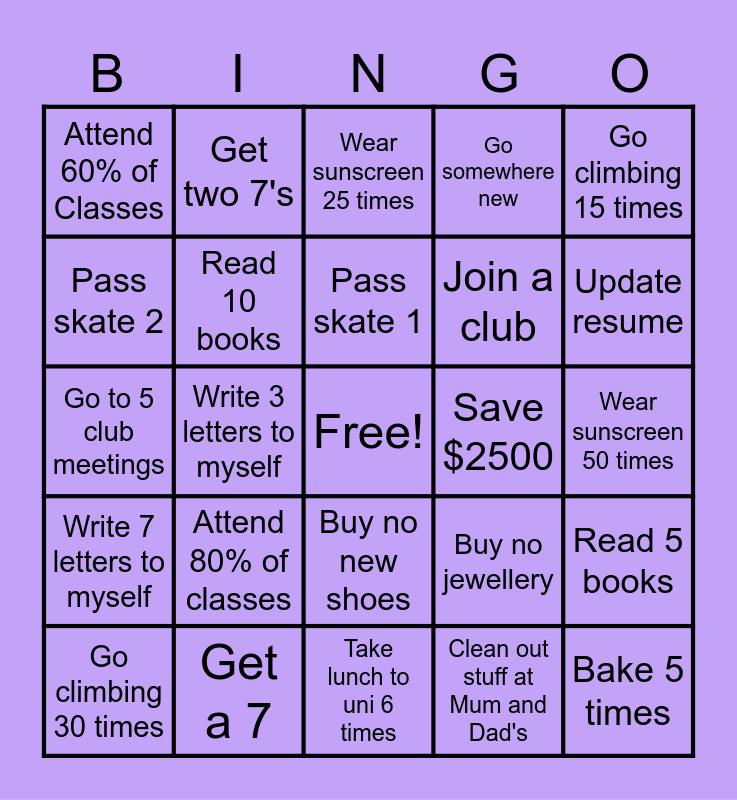 This bingo card has a free space and 24 words: Attend 80% of classes, Get a 7, Pass skate 1, Go climbing 30 times, Go climbing 15 times, Attend 60% of Classes, Pass skate 2, Get two 7's, Save $2500, Buy no new shoes, Join a club, Go to 5 club meetings, Buy no jewellery, Read 5 books, Read 10 books, Clean out stuff at Mum and Dad's, Wear sunscreen 50 times, Wear sunscreen 25 times, Update resume, Write 3 letters to myself, Bake 5 times, Write 7 letters to myself, Go somewhere new and Take lunch to uni 6 times.