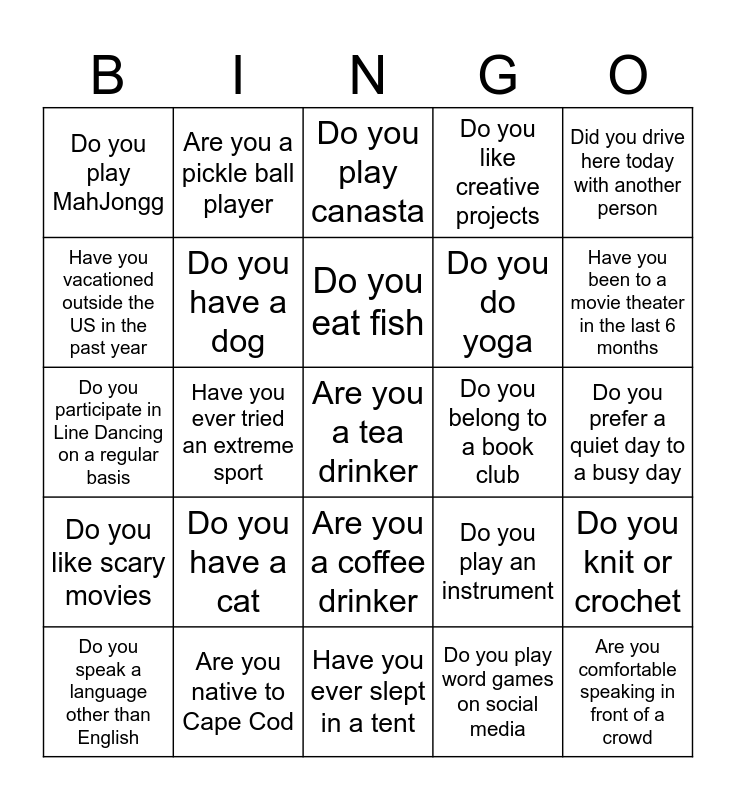 This bingo card has a free space and 24 words: Do you have a cat, Are you native to Cape Cod, Do you eat fish, Do you speak a language other than English, Did you drive here today with another person, Do you play MahJongg, Have you vacationed outside the US in the past year, Are you a pickle ball player, Do you belong to a book club, Are you a coffee drinker, Do you do yoga, Do you participate in Line Dancing on a regular basis, Do you play an instrument, Do you knit or crochet, Do you have a dog, Do you play word games on social media, Do you prefer a quiet day to a busy day, Do you play canasta, Have you been to a movie theater in the last 6 months, Have you ever tried an extreme sport, Are you comfortable speaking in front of a crowd, Do you like scary movies, Do you like creative projects and Have you ever slept in a tent.