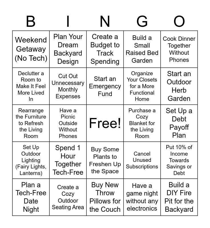 This bingo card has a free space and 25 words: Spend 1 Hour Together Tech-Free, Buy New Throw Pillows for the Couch, Start an Emergency Fund, Plan a Tech-Free Date Night, Cook Dinner Together Without Phones, Weekend Getaway (No Tech), Declutter a Room to Make It Feel More Lived In, Plan Your Dream Backyard Design, Purchase a Cozy Blanket for the Living Room, Buy Some Plants to Freshen Up the Space, Organize Your Closets for a More Functional Home, Rearrange the Furniture to Refresh the Living Room, Cancel Unused Subscriptions, Put 10% of Income Towards Savings or Debt, Cut Out Unnecessary Monthly Expenses, Pay Off Your Smallest Debt, Set Up a Debt Payoff Plan, Create a Budget to Track Spending, Start an Outdoor Herb Garden, Have a Picnic Outside Without Phones, Build a DIY Fire Pit for the Backyard, Create a Cozy Outdoor Seating Area, Set Up Outdoor Lighting (Fairy Lights, Lanterns), Build a Small Raised Bed Garden and Have a game night without any electronics.
