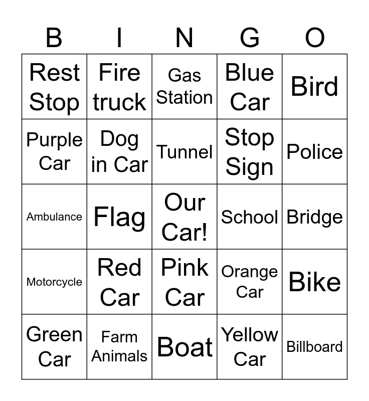 This bingo card has a free space and 24 words: Red Car, Farm Animals, Tunnel, Green Car, Bird, Rest Stop, Purple Car, Fire truck, School, Pink Car, Stop Sign, Ambulance, Orange Car, Bike, Dog in Car, Yellow Car, Bridge, Gas Station, Police, Flag, Billboard, Motorcycle, Blue Car and Boat.