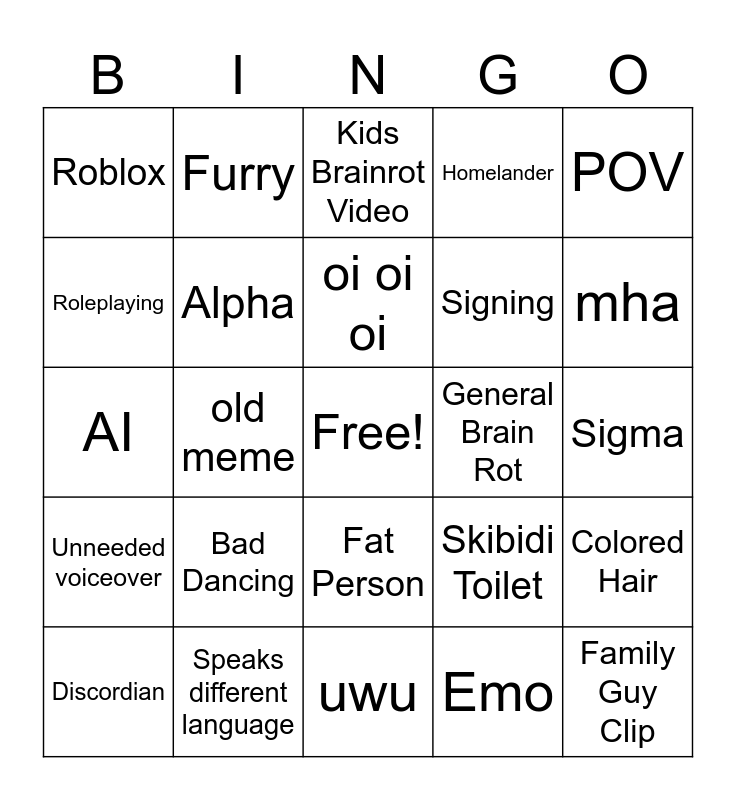 This bingo card has a free space and 24 words: Bad Dancing, Speaks different language, oi oi oi, Discordian, POV, Roblox, Roleplaying, Furry, General Brain Rot, Fat Person, Signing, AI, Skibidi Toilet, Colored Hair, Alpha, Emo, Sigma, Kids Brainrot Video, mha, old meme, Family Guy Clip, Unneeded voiceover, Homelander and uwu.