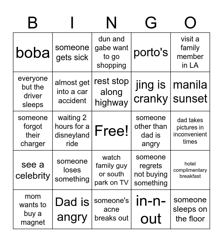 This bingo card has a free space and 24 words: someone loses something, Dad is angry, rest stop along highway, mom wants to buy a magnet, visit a family member in LA, boba, everyone but the driver sleeps, someone gets sick, someone other than dad is angry, watch family guy or south park on TV, jing is cranky, someone forgot their charger, someone regrets not buying something, hotel complimentary breakfast, almost get into a car accident, in-n-out, dad takes pictures in inconvenient times, dun and gabe want to go shopping, manila sunset, waiting 2 hours for a disneyland ride, someone sleeps on the floor, see a celebrity, porto's and someone's acne breaks out.