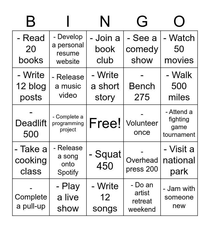This bingo card has a free space and 24 words: - Release a song onto Spotify, - Play a live show, - Write a short story, - Complete a pull-up, - Watch 50 movies, - Read 20 books, - Write 12 blog posts, - Develop a personal resume website, - Volunteer once, - Squat 450, - Bench 275, - Deadlift 500, - Overhead press 200, - Visit a national park, - Release a music video, - Do an artist retreat weekend, - Attend a fighting game tournament, - Join a book club, - Walk 500 miles, - Complete a programming project, - Jam with someone new, - Take a cooking class, - See a comedy show and - Write 12 songs.