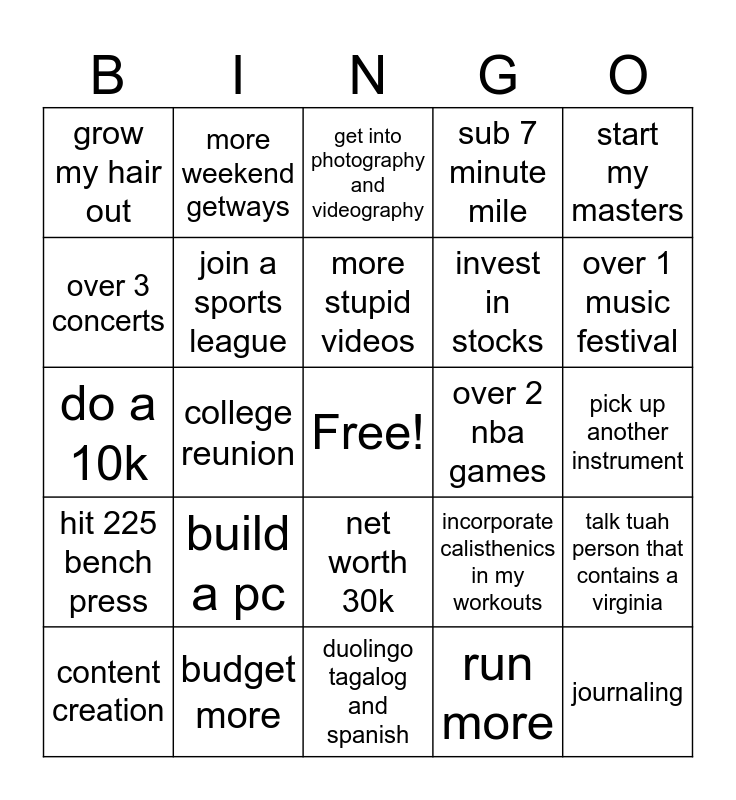 This bingo card has a free space and 24 words: build a pc, budget more, more stupid videos, content creation, start my masters, grow my hair out, over 3 concerts, more weekend getways, over 2 nba games, net worth 30k, invest in stocks, do a 10k, incorporate calisthenics in my workouts, talk tuah person that contains a virginia, join a sports league, run more, pick up another instrument, get into photography and videography, over 1 music festival, college reunion, journaling, hit 225 bench press, sub 7 minute mile and duolingo tagalog and spanish.