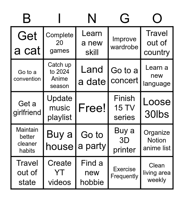 This bingo card has a free space and 24 words: Buy a house, Create YT videos, Land a date, Travel out of state, Travel out of country, Get a cat, Go to a convention, Complete 20 games, Finish 15 TV series, Go to a party, Go to a concert, Get a girlfriend, Buy a 3D printer, Organize Notion anime list, Catch up to 2024 Anime season, Exercise Frequently, Loose 30lbs, Learn a new skill, Learn a new language, Update music playlist, Clean living area weekly, Maintain better cleaner habits, Improve wardrobe and Find a new hobbie.