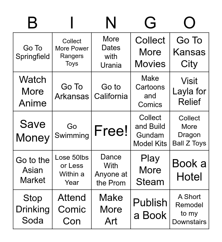 This bingo card has a free space and 24 words: Lose 50lbs or Less Within a Year, Attend Comic Con, Go to California, Stop Drinking Soda, Go To Kansas City, Go To Springfield, Watch More Anime, Collect More Power Rangers Toys, Collect and Build Gundam Model Kits, Dance With Anyone at the Prom, Make Cartoons and Comics, Save Money, Play More Steam, Book a Hotel, Go To Arkansas, Publish a Book, Collect More Dragon Ball Z Toys, More Dates with Urania, Visit Layla for Relief, Go Swimming, A Short Remodel to my Downstairs, Go to the Asian Market, Collect More Movies and Make More Art.