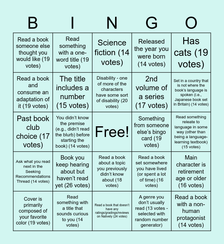 This bingo card has a free space and 25 words: Book you keep hearing about but haven’t read yet (26 votes), Read a book that doesn’t have any ratings/gradings/reviews on Natively (24 votes), Disability - one of more of the characters have some sort of disability (20 votes), Cover is primarily composed of your favorite color (19 votes), Has cats (19 votes), Read a book someone else thought you would like (19 votes), Read a book and consume an adaptation of it (19 votes), Read something with a one-word title (19 votes), Something from someone else’s bingo card (19 votes), Read a book about a topic you previously didn’t know about (18 votes), 2nd volume of a series (17 votes), Past book club choice (17 votes), Read a book set somewhere you have lived (or spent a lot of time) (16 votes), Main character is retirement age or older (16 votes), The title includes a number (15 votes), Read a book at a Natively level you haven’t covered yet (i.e., it doesn’t have to be your hardest book yet, althought that would count, it could be a level you skipped over) (15 votes), Read something releate to language in some way (other than being a language-learning textbook) (15 votes), Science fiction (14 votes), Set in a country that is not where the book’s language is spoken (i.e., Japanese book set in Britain) (14 votes), You didn’t know the premise (e.g., didn’t read the blurb) before starting the book) (14 votes), Read a book with a non-human protagonist (14 votes), Read something with a title that sounds curious to you (14 votes), Ask what you read next in the Seeking Recommendations Thread (14 votes), Released the year you were born (14 votes) and A genre you don’t usually read (13 votes - selected with random number generator).