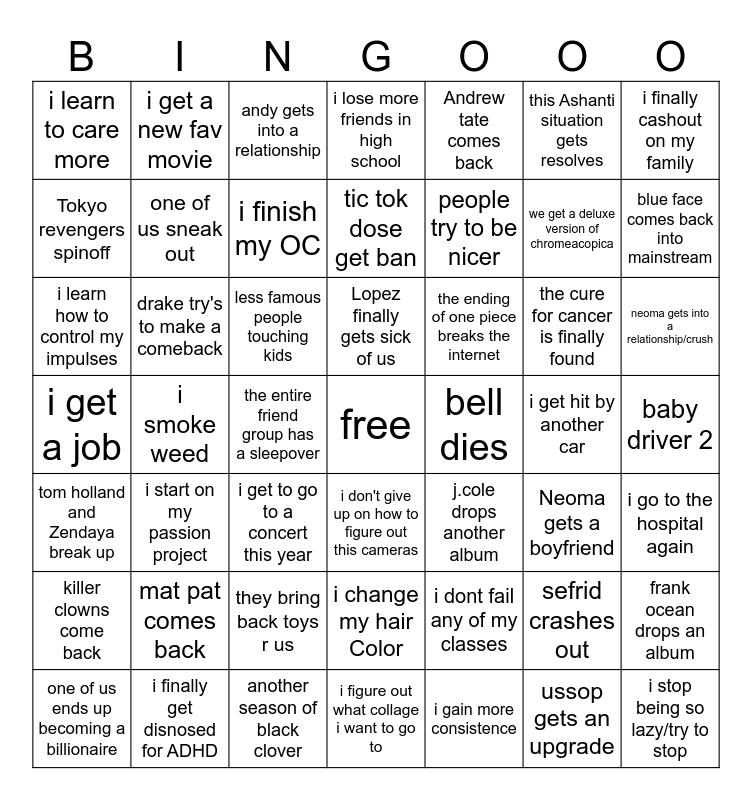 This bingo card has a free space and 83 words: i actually do my passion project, i change my hair Color, andy gets into a relationship, i finally get disnosed for ADHD, someone close dies, i stick to my new year's resolutions, mat pat comes back, will get into a relationship, killer clowns come back, i figure out what collage i want to go to, i get into my first fight, i get my first ear piercing, i finally cashout on my family, blue face comes back into mainstream, andy changes her hair color white, i learn to care more, neoma gets into a relationship/crush, this Ashanti situation gets resolves, i get first place, i don't give up on how to figure out this cameras, i go to the hospital again, one of us sneak out, we get a deluxe version of chromeacopica, andy goes back to court, people try to be nicer, trump dies, i gain more consistence, neoma gets under the influence, we get are spiderman movie, i get a style, less famous people touching kids, i get a new phone, j.cole drops another album, tic tok dose get ban, i stop being so lazy/try to stop, i get hit by another car, i smoke weed, Donald glover gets to play spiderman, i finish my OC, drake try's to make a comeback, i start on my passion project, Neoma gets a boyfriend, my glasses break, trump turns out to be gay, one of us ends up becoming a billionaire, frank ocean drops an album, i get a new fav movie, i dont fail any of my classes, the school board changes, i breakdown, the ending of one piece breaks the internet, i lose more friends in high school, i learn how to control my impulses, i get more money, i get those homecoming pictures that andy still has, someone in the friend group loses there v card, i get to go to a concert this year, love triangle in the friend group, i get a job, my mom and my brother go to family therapy, they bring back toys r us, assassination classroom gets a spinoff, i get called a fashion, Andrew tate comes back, i go to therapy, the cure for cancer is finally found, I start to care more, tom holland and Zendaya break up, hunterxhunter gets another season, my brother and his baby mama fix there relationship, Aiden dies school bus graveyard, sefrid crashes out, we get more transfer students, Lopez finally gets sick of us, the entire friend group has a sleepover, the friend group takes better care of their health, ussop gets an upgrade, Tokyo revengers spinoff, baby driver 2, bell dies, another season of black clover, i hang out with senior friends more and i get my first kiss.