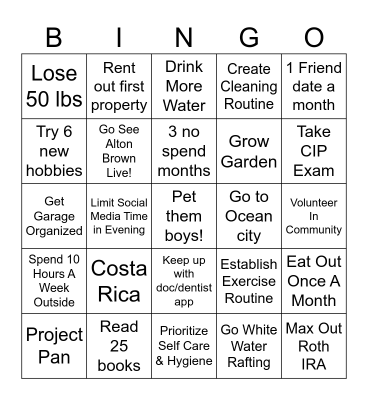 This bingo card has a free space and 24 words: Costa Rica, Read 25 books, 3 no spend months, Project Pan, 1 Friend date a month, Lose 50 lbs, Try 6 new hobbies, Rent out first property, Go to Ocean city, Keep up with doc/dentist app, Grow Garden, Get Garage Organized, Establish Exercise Routine, Eat Out Once A Month, Go See Alton Brown Live!, Go White Water Rafting, Volunteer In Community, Drink More Water, Take CIP Exam, Limit Social Media Time in Evening, Max Out Roth IRA, Spend 10 Hours A Week Outside, Create Cleaning Routine and Prioritize Self Care & Hygiene.