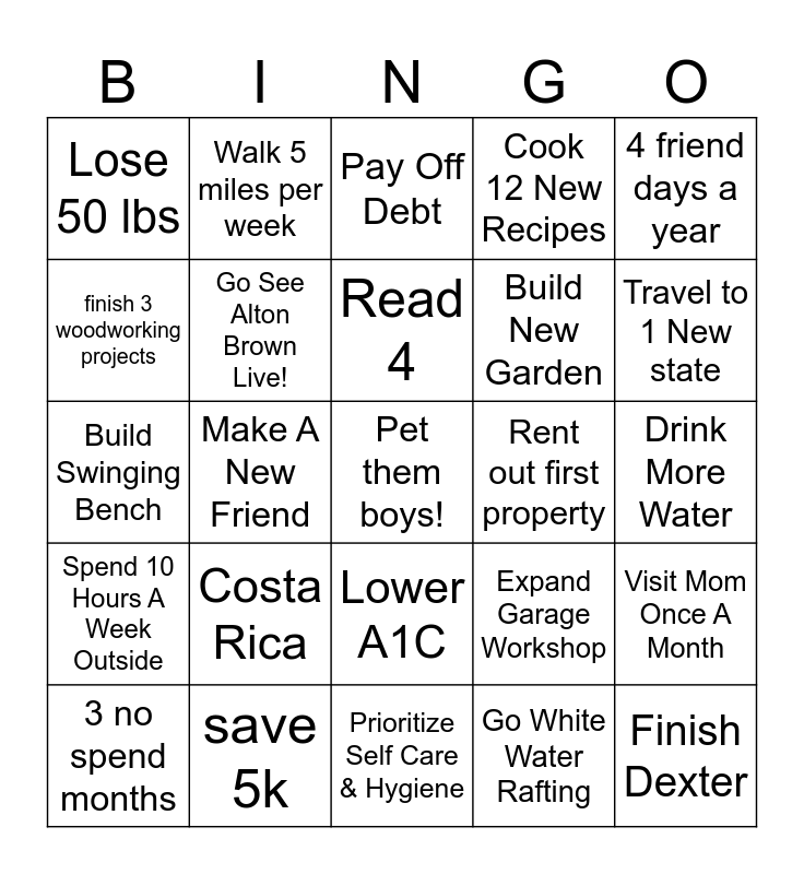 This bingo card has a free space and 24 words: Costa Rica, save 5k, Read 4, 3 no spend months, 4 friend days a year, Lose 50 lbs, finish 3 woodworking projects, Walk 5 miles per week, Rent out first property, Lower A1C, Build New Garden, Build Swinging Bench, Expand Garage Workshop, Visit Mom Once A Month, Go See Alton Brown Live!, Go White Water Rafting, Drink More Water, Pay Off Debt, Travel to 1 New state, Make A New Friend, Finish Dexter, Spend 10 Hours A Week Outside, Cook 12 New Recipes and Prioritize Self Care & Hygiene.