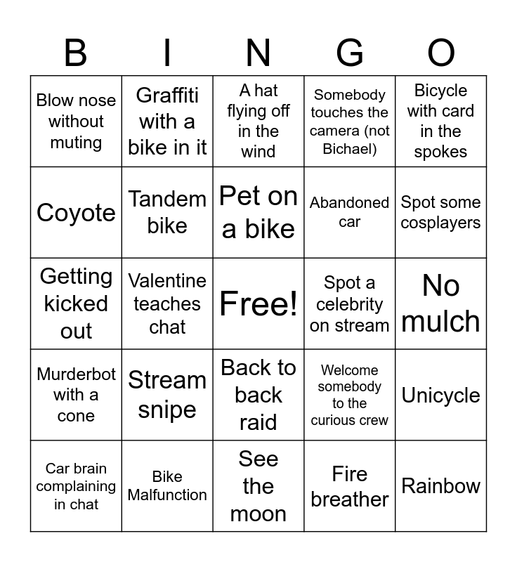 This bingo card has a free space and 36 words: Wheelie, Rain, Ride out/massive group ride, Tandem bike, Welcome somebody to the curious crew, Murderbot with a cone, Pet on a bike, Extreme weather, Bicycle with card in the spokes, Backwards Brian, Valentine teaches chat, Somebody touches the camera (not Bichael), Visit a new destination, Spot a celebrity on stream, Spot some cosplayers, Blow nose without muting, Forgetting to unmute, Stream snipe, Rainbow, A hat flying off in the wind, No mulch, Unicycle, Bike Malfunction, Car brain complaining in chat, See the moon, Graffiti with a bike in it, Getting kicked out, Somebody gifting 10 subs, Abandoned car, Coyote, Car with broken window, Piano, Fire breather, Back to back raid, Ice cream truck and Bike Pretty.