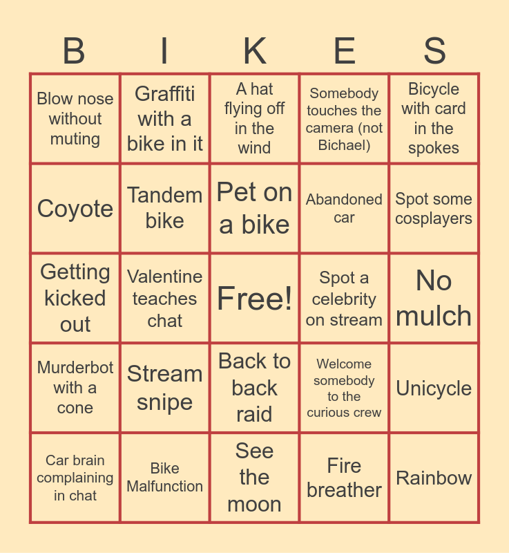 This bingo card has a free space and 36 words: Wheelie, Rain, Ride out/massive group ride, Tandem bike, Welcome somebody to the curious crew, Murderbot with a cone, Pet on a bike, Extreme weather, Bicycle with card in the spokes, Backwards Brian, Valentine teaches chat, Somebody touches the camera (not Bichael), Visit a new destination, Spot a celebrity on stream, Spot some cosplayers, Blow nose without muting, Forgetting to unmute, Stream snipe, Rainbow, A hat flying off in the wind, No mulch, Unicycle, Bike Malfunction, Car brain complaining in chat, See the moon, Graffiti with a bike in it, Getting kicked out, Somebody gifting 10 subs, Abandoned car, Coyote, Car with broken window, Piano, Fire breather, Back to back raid, Ice cream truck and Bike Pretty.