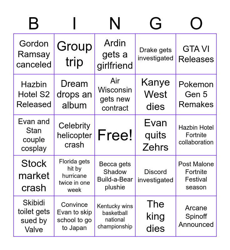 This bingo card has a free space and 24 words: Florida gets hit by hurricane twice in one week, Convince Evan to skip school to go to Japan, Air Wisconsin gets new contract, Skibidi toilet gets sued by Valve, GTA VI Releases, Gordon Ramsay canceled, Hazbin Hotel S2 Released, Group trip, Evan quits Zehrs, Becca gets Shadow Build-a-Bear plushie, Kanye West dies, Evan and Stan couple cosplay, Discord investigated, Post Malone Fortnite Festival season, Dream drops an album, The king dies, Hazbin Hotel Fortnite collaboration, Ardin gets a girlfriend, Pokemon Gen 5 Remakes, Celebrity helicopter crash, Arcane Spinoff Announced, Stock market crash, Drake gets investigated and Kentucky wins basketball national championship.