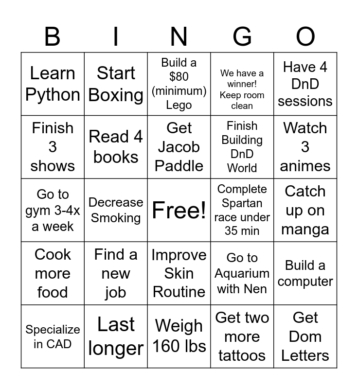 This bingo card has a free space and 24 words: Find a new job, Last longer, Get Jacob Paddle, Specialize in CAD, Have 4 DnD sessions, Learn Python, Finish 3 shows, Start Boxing, Complete Spartan race under 35 min, Improve Skin Routine, Finish Building DnD World, Go to gym 3-4x a week, Go to Aquarium with Nen, Build a computer, Read 4 books, Get two more tattoos, Catch up on manga, Build a $80 (minimum) Lego, Watch 3 animes, Decrease Smoking, Get Dom Letters, Cook more food, We have a winner! Keep room clean and Weigh 160 lbs.