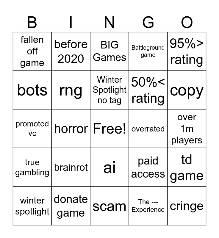 This bingo card has a free space and 24 words: brainrot, donate game, Winter Spotlight no tag, winter spotlight, 95%> rating, fallen off game, bots, before 2020, overrated, ai, 50%< rating, promoted vc, paid access, td game, rng, The --- Experience, over 1m players, BIG Games, copy, horror, cringe, true gambling, Battleground game and scam.