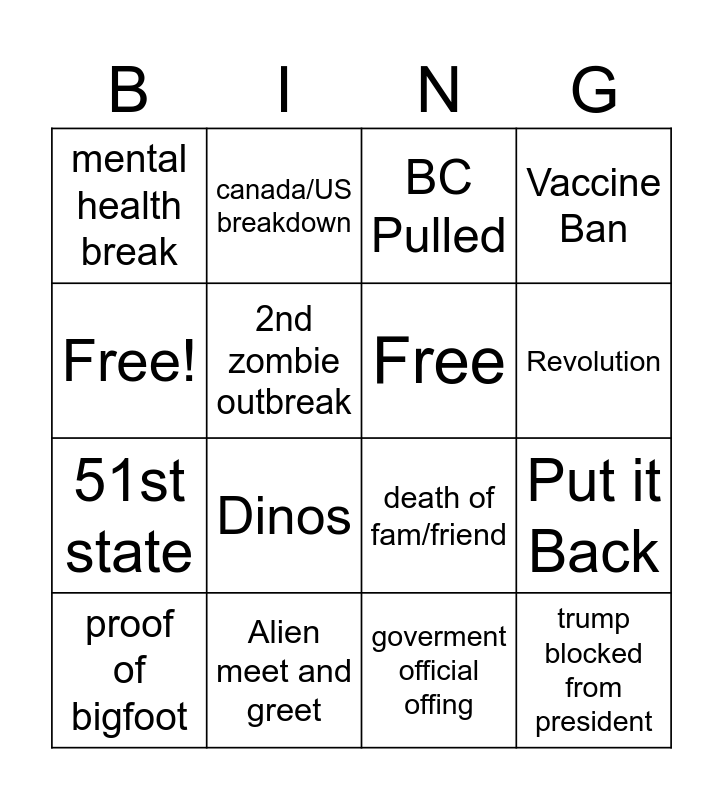 This bingo card has 16 words: Alien meet and greet, Put it Back, BC Pulled, mental health break, 51st state, canada/US breakdown, death of fam/friend, goverment official offing, Free!, 2nd zombie outbreak, proof of bigfoot, Vaccine Ban, Dinos, Revolution, Free and trump blocked from president.
