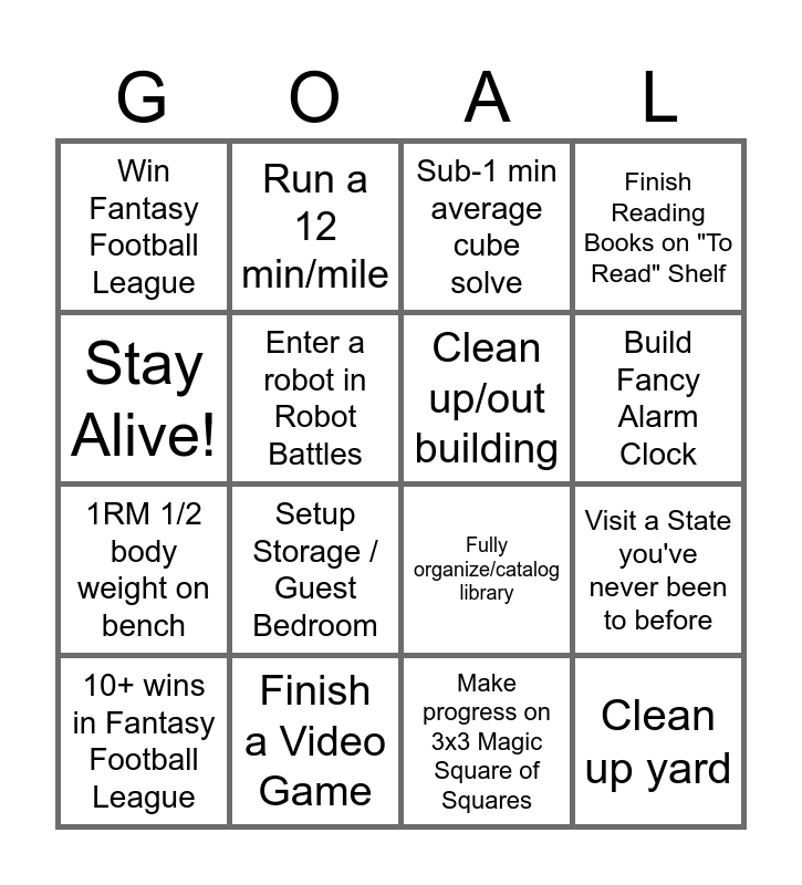 This bingo card has 16 words: Finish a Video Game, Visit a State you've never been to before, Sub-1 min average cube solve, Win Fantasy Football League, 1RM 1/2 body weight on bench, Run a 12 min/mile, Fully organize/catalog library, Make progress on 3x3 Magic Square of Squares, Stay Alive!, Enter a robot in Robot Battles, 10+ wins in Fantasy Football League, Finish Reading Books on "To Read" Shelf, Setup Storage / Guest Bedroom, Build Fancy Alarm Clock, Clean up/out building and Clean up yard.