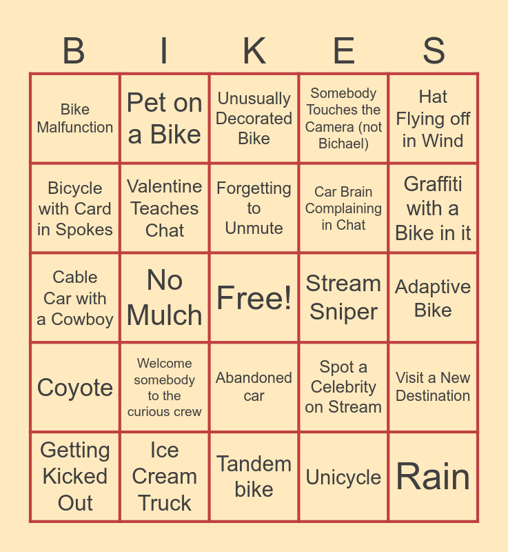 This bingo card has a free space and 49 words: Wheelie, Rain, Ride out/massive group ride, Tandem bike, Welcome somebody to the curious crew, Coned Murderbot, Pet on a Bike, Extreme Weather, Bicycle with Card in Spokes, Backwards Brian, Valentine Teaches Chat, Somebody Touches the Camera (not Bichael), Visit a New Destination, Spot a Celebrity on Stream, Spot Cosplayers, Blow Nose without Muting, Forgetting to Unmute, Stream Sniper, Rainbow, Hat Flying off in Wind, No Mulch, Unicycle, Bike Malfunction, Car Brain Complaining in Chat, See the Moon, Graffiti with a Bike in it, Getting Kicked Out, Somebody Gifting 10 Subs, Abandoned car, Coyote, Car with Broken Window, Piano, Fire Breather, Back to Back Raid, Ice Cream Truck, Bike Pretty, Train ride, Bike with Oversized Cargo, Adaptive Bike, Seeing @admanta_ Leading a Tour, Someone Eating a Taco, Taco Bell, Person Wearing Shorts and Sandals, Meeting Another Streamer, Cable Car with a Cowboy, Unusually Decorated Bike, Cross Paths with a Protest, Getting Lost and Accidental Parade.