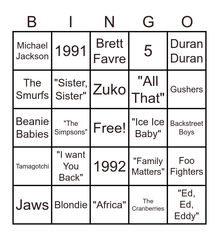 This bingo card has a free space and 24 words: "I want You Back", Blondie, Zuko, Jaws, Duran Duran, Michael Jackson, The Smurfs, 1991, "Ice Ice Baby", 1992, "All That", Beanie Babies, "Family Matters", Foo Fighters, "Sister, Sister", The Cranberries, Backstreet Boys, Brett Favre, Gushers, "The Simpsons", "Ed, Ed, Eddy", Tamagotchi, 5 and "Africa".
