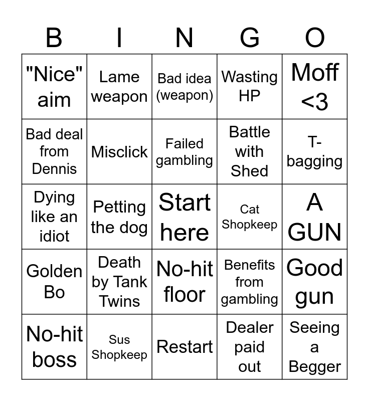 This bingo card has a free space and 24 words: Death by Tank Twins, Sus Shopkeep, Failed gambling, No-hit boss, Moff <3, "Nice" aim, Bad deal from Dennis, Lame weapon, Cat Shopkeep, No-hit floor, Battle with Shed, Dying like an idiot, Benefits from gambling, Good gun, Misclick, Dealer paid out, A GUN, Bad idea (weapon), T-bagging, Petting the dog, Seeing a Begger, Golden Bo, Wasting HP and Restart.