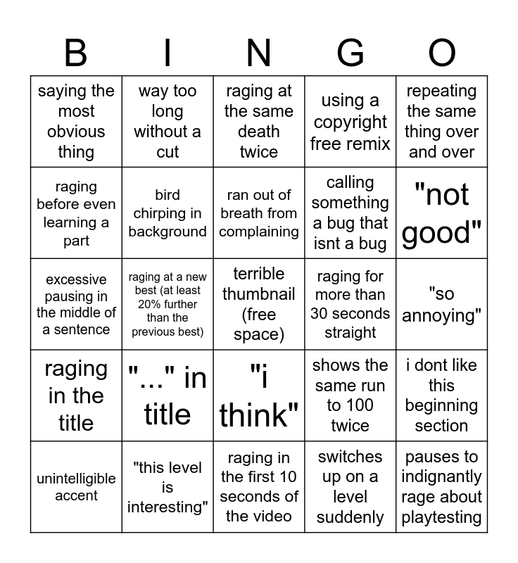 This bingo card has a free space and 25 words: "..." in title, raging in the first 10 seconds of the video, ran out of breath from complaining, unintelligible accent, repeating the same thing over and over, saying the most obvious thing, raging before even learning a part, way too long without a cut, raging for more than 30 seconds straight, "i think", calling something a bug that isnt a bug, excessive pausing in the middle of a sentence, shows the same run to 100 twice, i dont like this beginning section, bird chirping in background, says "i dont know" more than 3 times, "so annoying", raging at the same death twice, "not good", raging at a new best (at least 20% further than the previous best), pauses to indignantly rage about playtesting, "this level is interesting", raging in the title, using a copyright free remix and switches up on a level suddenly.