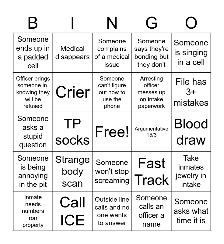 This bingo card has a free space and 35 words: Refusal, Supervisor to intake, Mule kick, Crier, Someone won't stop screaming, Someone says they're bonding but they don't, Officer brings someone in, knowing they will be refused, Sleeping on floor, Someone can't figure out how to use the phone, Someone asks for a PB&J, Someone asks a stupid question, Someone is singing in a cell, Someone complains it's too cold, Welcoming Party, Someone ends up in a padded cell, Argumentative 15/3, Someone calls an officer a name, TP socks, Someone is being annoying in the pit, Someone asks what time it is, Fast Track, Inmate needs numbers from property, Take inmates jewelry in intake, Call ICE, Someone complains of a medical issue, File has 3+ mistakes, Shoe pillows, Someone demands phone call, Arresting officer messes up on intake paperwork, Blood draw, Someone claims they've already taken care of a warrant, Outside line calls and no one wants to answer, Strange body scan, Medical disappears and Use translator.