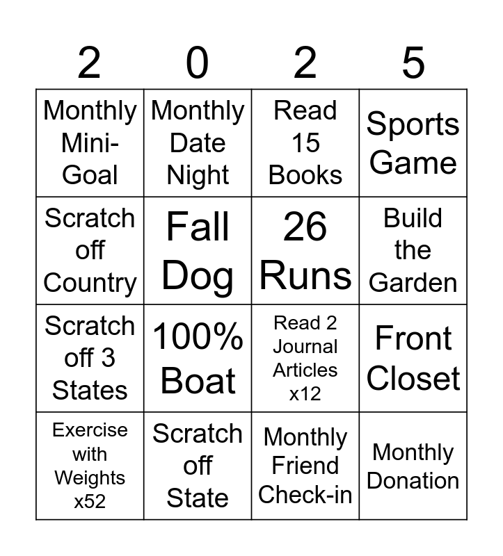 This bingo card has 16 words: Scratch off State, Front Closet, Read 15 Books, Monthly Mini-Goal, Scratch off 3 States, Monthly Date Night, Read 2 Journal Articles x12, Monthly Friend Check-in, Scratch off Country, Fall Dog, Exercise with Weights x52, Sports Game, 100% Boat, Build the Garden, 26 Runs and Monthly Donation.
