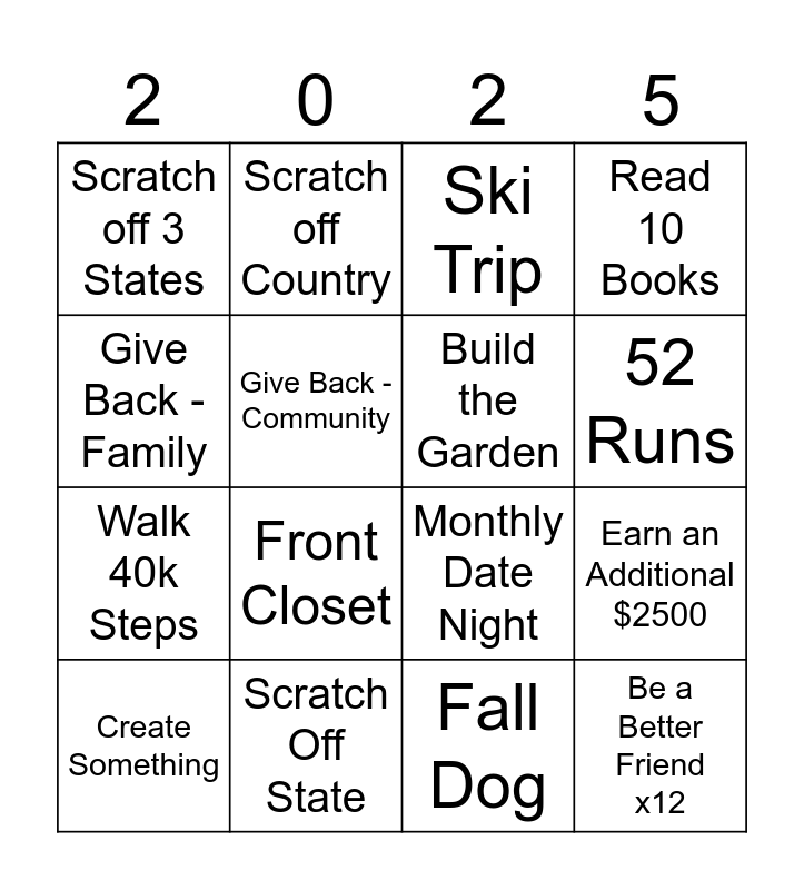 This bingo card has 16 words: Scratch Off State, Earn an Additional $2500, Ski Trip, Scratch off 3 States, Walk 40k Steps, Scratch off Country, Monthly Date Night, Fall Dog, Give Back - Family, Give Back - Community, Create Something, Read 10 Books, Front Closet, 52 Runs, Build the Garden and Be a Better Friend x12.