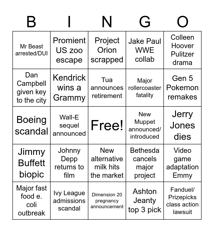 This bingo card has a free space and 24 words: Johnny Depp returns to film, Ivy League admissions scandal, Tua announces retirement, Major fast food e. coli outbreak, Colleen Hoover Pulitzer drama, Mr Beast arrested/DUI, Dan Campbell given key to the city, Promient US zoo escape, New Muppet announced/ introduced, New alternative milk hits the market, Major rollercoaster fatality, Boeing scandal, Bethesda cancels major project, Video game adaptation Emmy, Kendrick wins a Grammy, Ashton Jeanty top 3 pick, Jerry Jones dies, Project Orion scrapped, Gen 5 Pokemon remakes, Wall-E sequel announced, Fanduel/ Prizepicks class action lawsuit, Jimmy Buffett biopic, Jake Paul WWE collab and Dimension 20 pregnancy announcement.