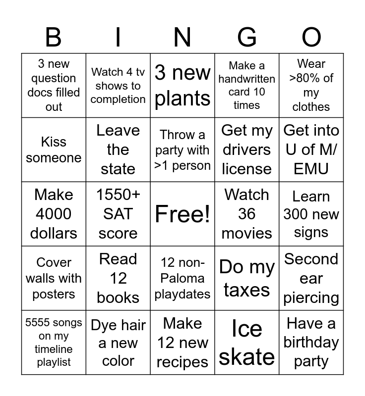This bingo card has a free space and 24 words: Read 12 books, Dye hair a new color, Throw a party with >1 person, 5555 songs on my timeline playlist, Wear >80% of my clothes, 3 new question docs filled out, Kiss someone, Watch 4 tv shows to completion, Watch 36 movies, 12 non-Paloma playdates, Get my drivers license, Make 4000 dollars, Do my taxes, Second ear piercing, Leave the state, Ice skate, Learn 300 new signs, 3 new plants, Get into U of M/ EMU, 1550+ SAT score, Have a birthday party, Cover walls with posters, Make a handwritten card 10 times and Make 12 new recipes.