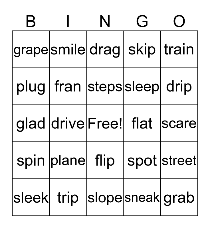 This bingo card has a free space and 24 words: plane, trip, steps, sleek, train, grape, plug, smile, flat, flip, sleep, glad, spot, street, fran, sneak, scare, drag, drip, drive, grab, spin, skip and slope.