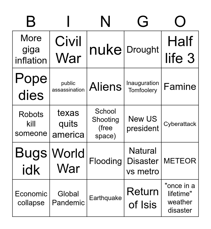 This bingo card has a free space and 24 words: World War, Global Pandemic, Aliens, Economic collapse, Half life 3, More giga inflation, Pope dies, Civil War, New US president, Flooding, Inauguration Tomfoolery, Robots kill someone, Natural Disaster vs metro, METEOR, public assassination, Return of Isis, Cyberattack, nuke, Famine, texas quits america, "once in a lifetime" weather disaster, Bugs idk, Drought and Earthquake.