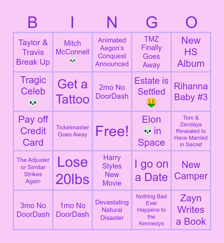 This bingo card has a free space and 24 words: Lose 20lbs, 1mo No DoorDash, 2mo No DoorDash, 3mo No DoorDash, New HS Album, Taylor & Travis Break Up, Tragic Celeb π, Mitch McConnell π, Elon πin Space, Harry Styles New Movie, Estate is Settled π€, Pay off Credit Card, I go on a Date, New Camper, Get a Tattoo, Nothing Bad Ever Happens to the Kennedys, Tom & Zendaya Revealed to Have Married in Secret, Animated Aegonβs Conquest Announced, Rihanna Baby #3, Ticketmaster Goes Away, Zayn Writes a Book, The Adjuster or Similar Strikes Again, TMZ Finally Goes Away and Devastating Natural Disaster.