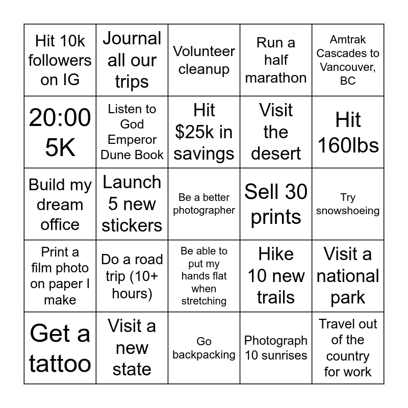 This bingo card has a free space and 24 words: Do a road trip (10+ hours), Visit a new state, Hit $25k in savings, Get a tattoo, Amtrak Cascades to Vancouver, BC, Hit 10k followers on IG, 20:00 5K, Journal all our trips, Sell 30 prints, Be able to put my hands flat when stretching, Visit the desert, Build my dream office, Hike 10 new trails, Visit a national park, Listen to God Emperor Dune Book, Photograph 10 sunrises, Try snowshoeing, Volunteer cleanup, Hit 160lbs, Launch 5 new stickers, Travel out of the country for work, Print a film photo on paper I make, Run a half marathon and Go backpacking.